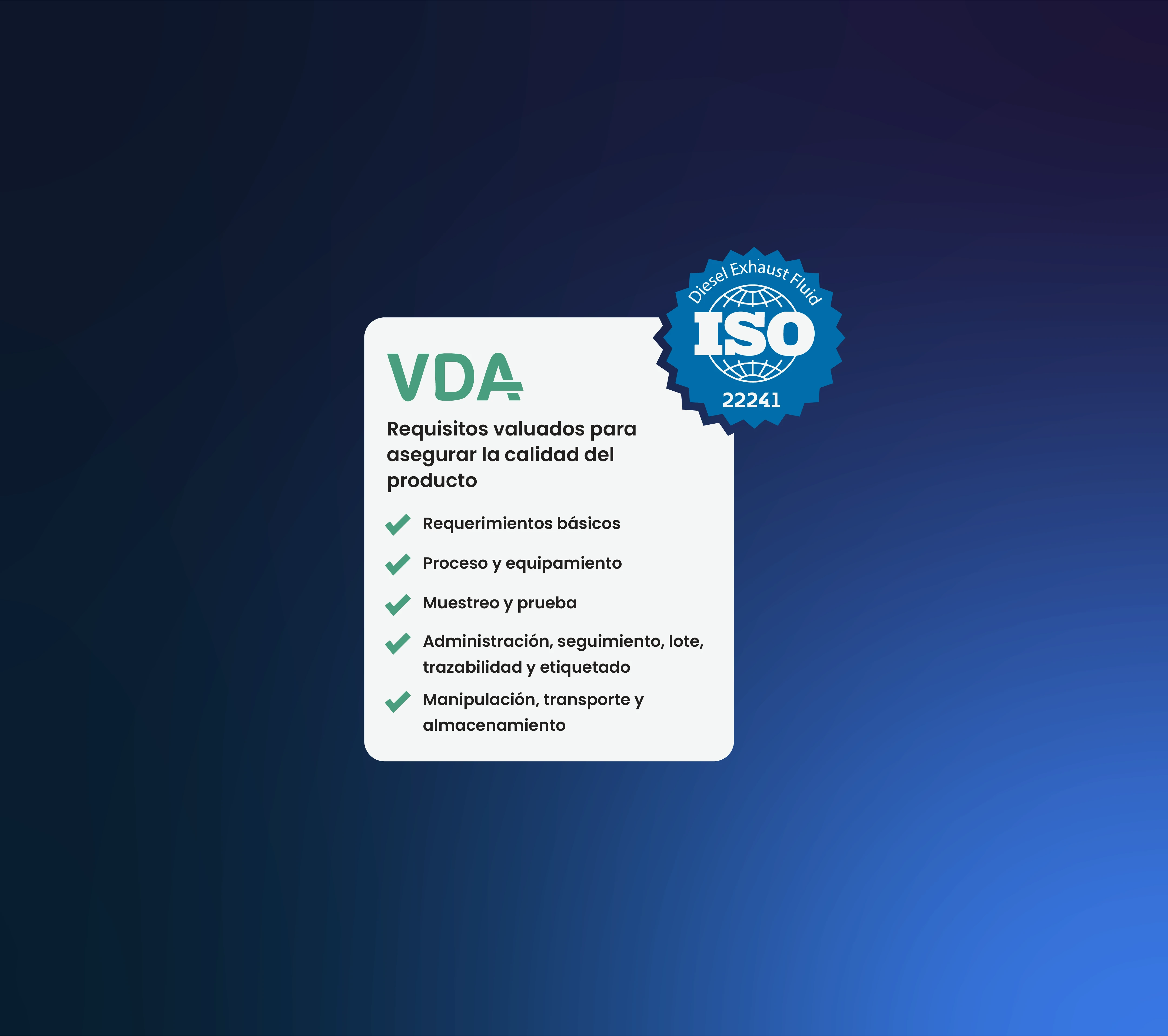 Nuestro Fluido de Escape Diésel (DEF) cumple con la norma internacional ISO 22241, asegurando pureza, estabilidad y rendimiento óptimo en motores con tecnología SCR